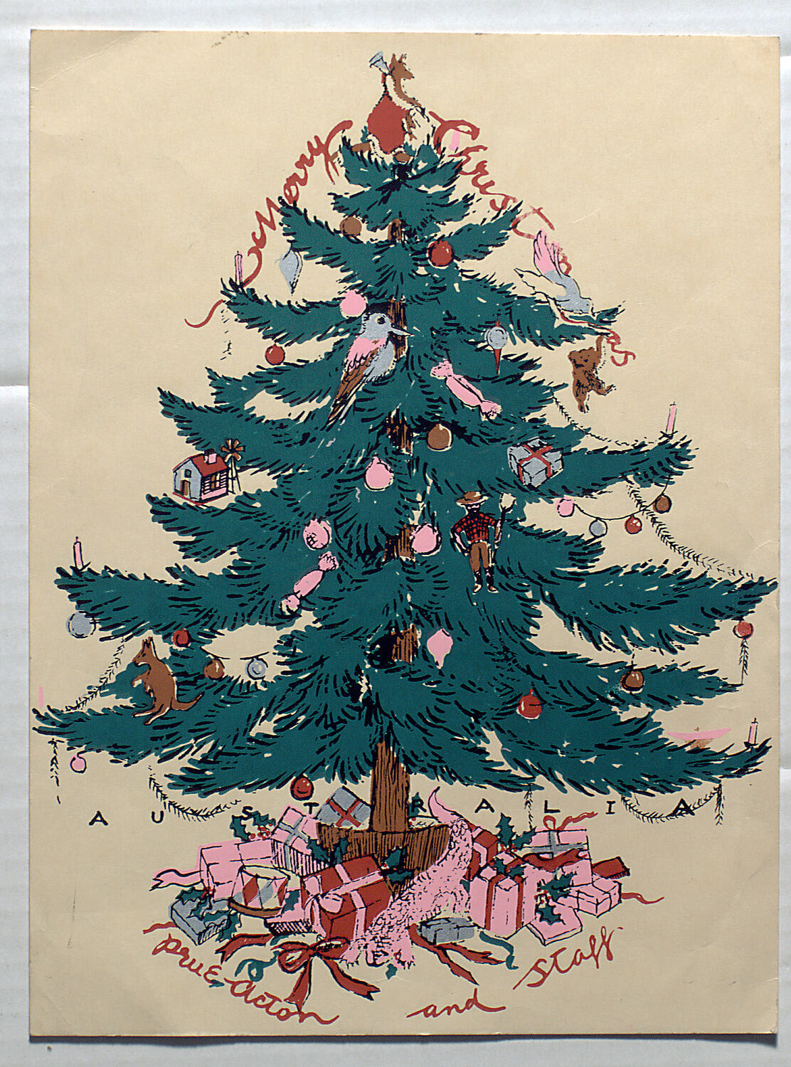 Front at top of tree: MERRY CHRISTMAS. Under tree: AUSTRALIA/PRUE ACTON AND STAFF.