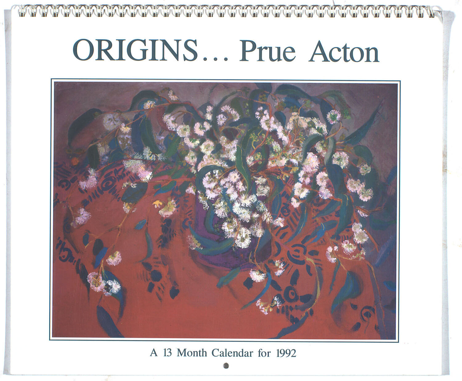 Printed in blue on front cover: ORIGINS...Prue Acton/ A 13 month calendar for 1992. Printed inside: blurb about Prue Acton, dates, handwritten notes in .2