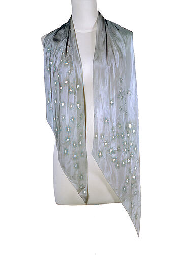 This layered outfit consists of a silk robe, three silk tops, a silk collar and a silk scarf: (1) Full length short sleeved silk robe in muted shades of green, blue and brown. Printed and handpainted seascape images by Rae Ganim surround the lower part of the robe. The front fastens with two thin tapes. (2) Flowing multi-layered sleeveless silk top in differing lengths, handerchief style. Handpainted in blues. (3 & 4) Skimpy sleeveless silk top with hole for neck hanging to a 'V' at front. Handpainted in green and brown. Press stud fastens at back. (5) Square silk collar handpainted in blue, white and beige.'Prue Acton' painted on front. Drapes to hand in a 'V' at front and back. (6) Rectangular silk scarf in muted green with handpainted designs in white and darker green. The scarf tapers to pointed ends. 'Prue Acton' painted on front. Drape to hang in a 'V' at front and back.