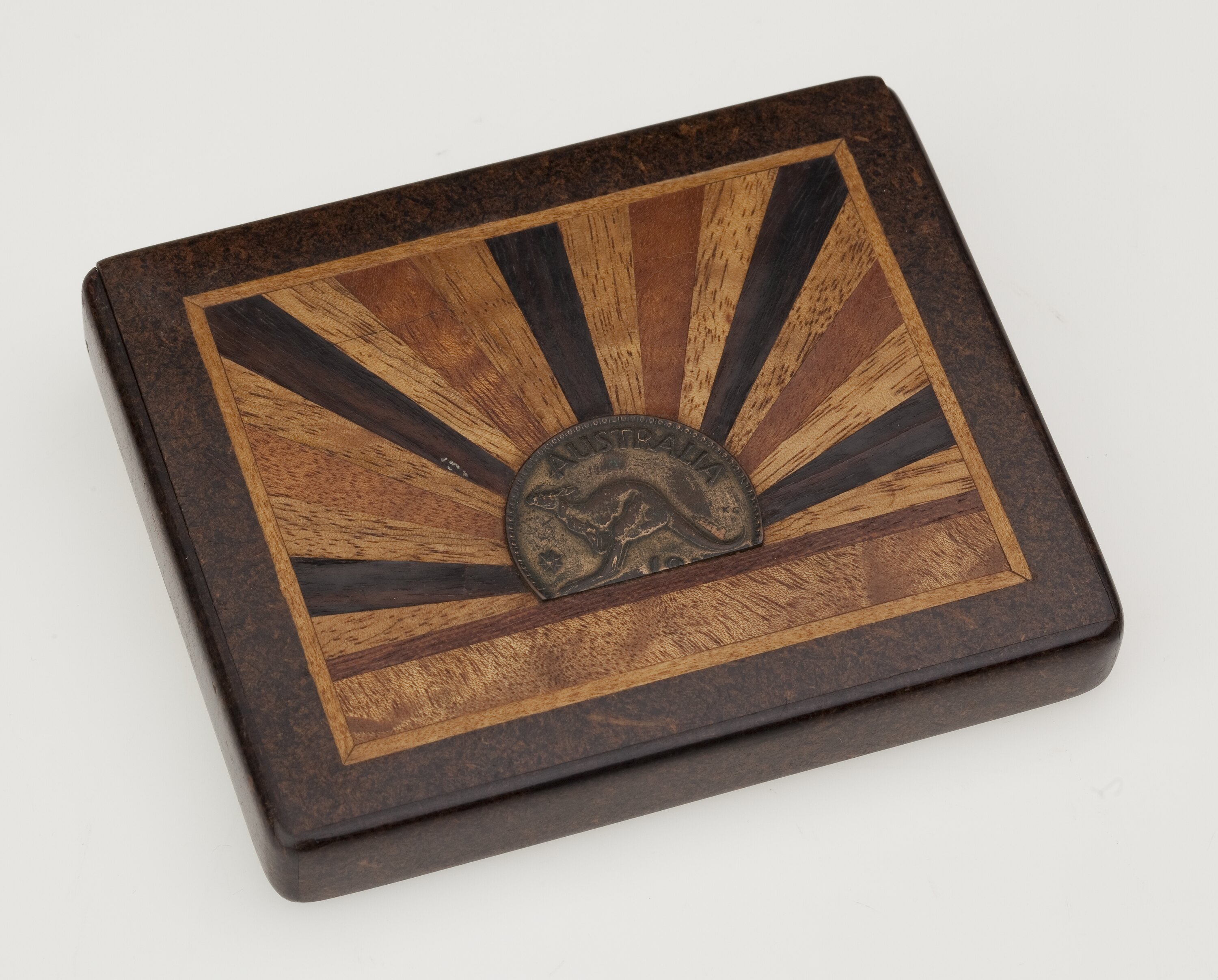 The rectangular dark wood case is hollow, leaving space for the cigarettes; it has a sliding inlay panel which allows it to be filled. The front of the case has a wooden inlay in a stylized "rising sun" design in various coloured and polished woods; the sun, itself, is formed by the use of approximately 2/3rd. of penny, leaving a kangaroo and "Australia" intact. The reverse also has an in layed wooden panel of various woods in blonde colours.