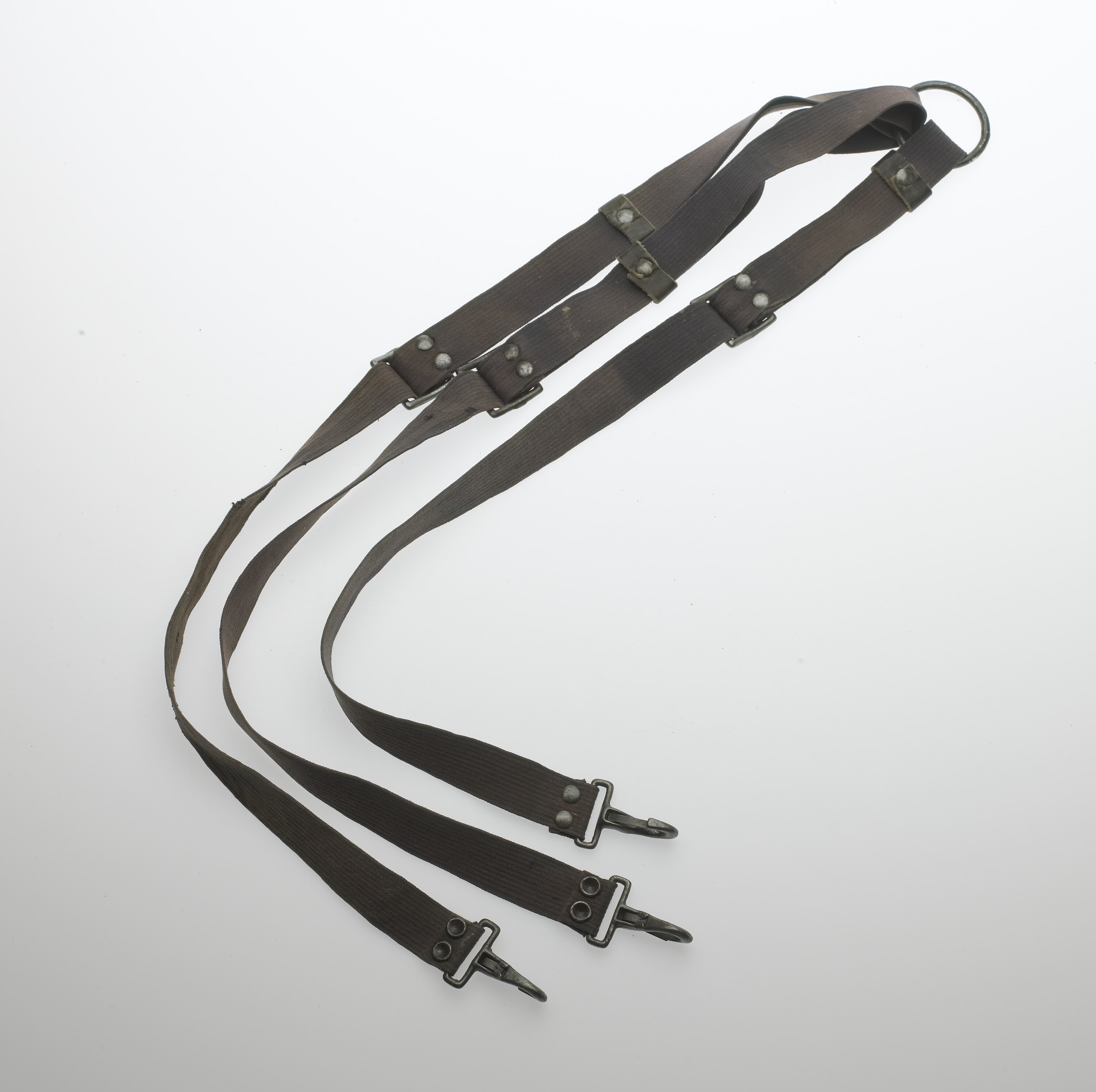 Girth strap made from blue cloth, consisting of 3 straps of different lengths fastened to a metal ring, with buckles and hooks attached to it.There is a leather ring around each of the straps, between the buckle and the ring.