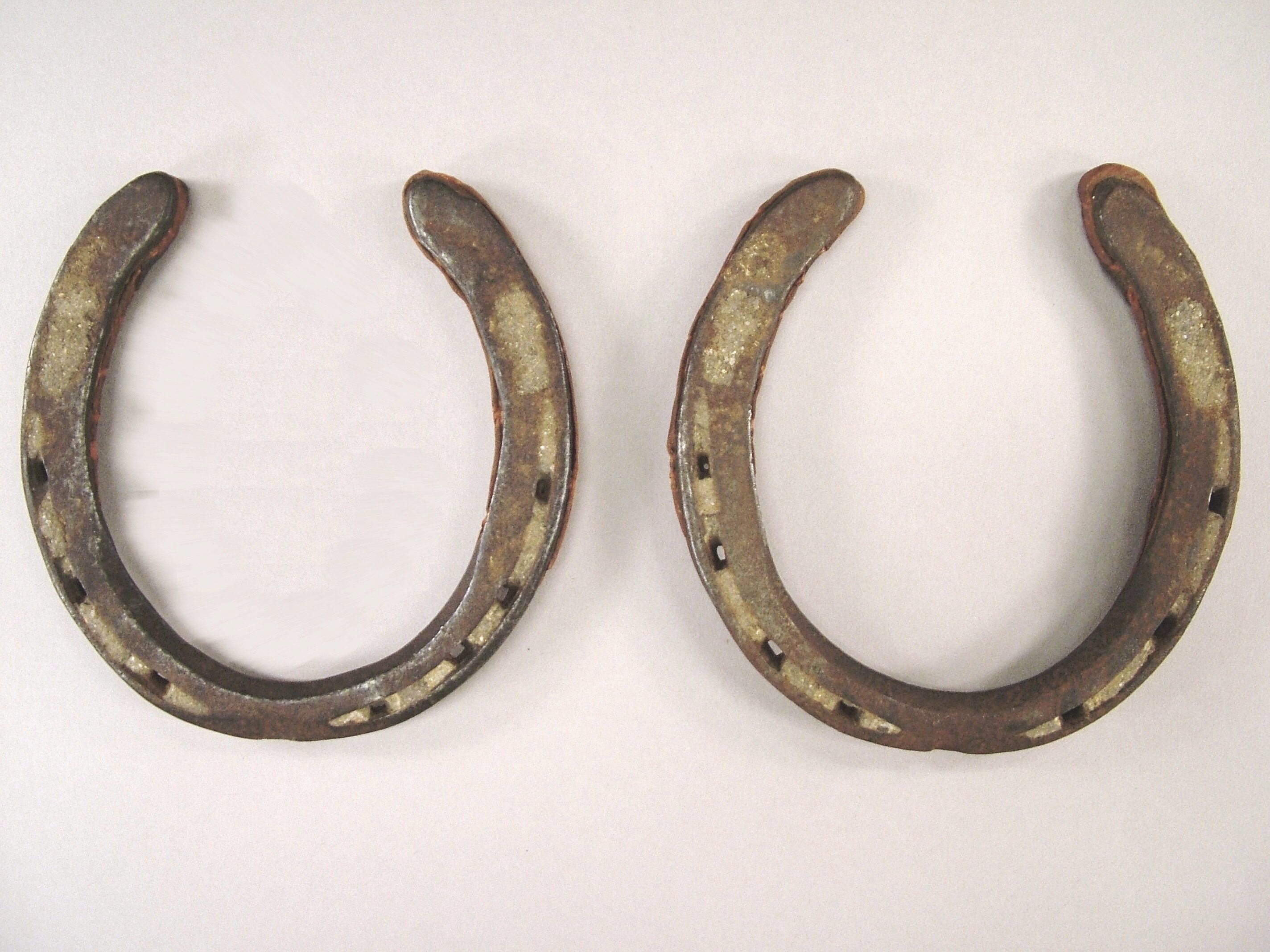 Pair of grey metal horseshoes belong to a collection of Phar Lap's equipment which had been keep in a suitcase by his strapper Tommy Woodcock as a memorial to his beloved friend.