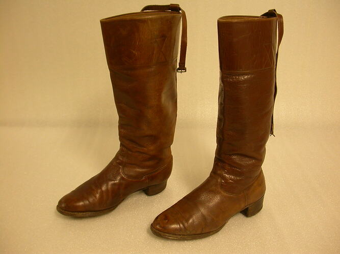 Worn by donor before her marriage, when she was Miss Riddington, at Allan's Flat, in the 1920s. A photograph of the donor wearing the boots is available in the supplementary file.