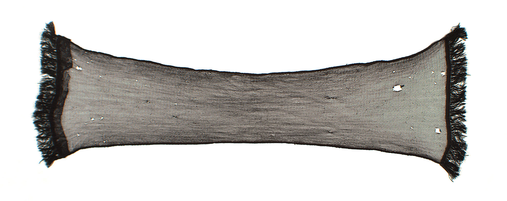 Black silk machine net evening scarf with fringe at each end.