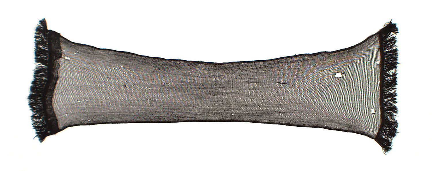 Black silk scarf. Belonged to Betty Anderson of Kew. Date unknown, but may be 1920s.