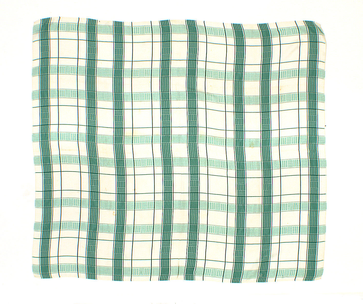 Green and white textile chequered tablecloth. White background with cheques formed by thick vertical dark green stripes inlaid with a geometric pattern and thick horizontal pale green stripes inlaid with a geometric pattern, thin vertical and horizontal dark green stripes compleat the chequered pattern.