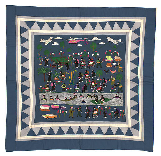 Embroidered banner made by members of the Hmong community in Victoria, circa 1985-1992. It tells the story of the Hmong's migration from Laos. The Victorian Hmong community developed after many Hmong fled from Laos in 1975 and arrived in Australia in mid 1980s after spending time in Thai refugee camps. The women of the Victorian Hmong community produced and sold these types of works at the Fitzroy Craft Market to supplement family income.