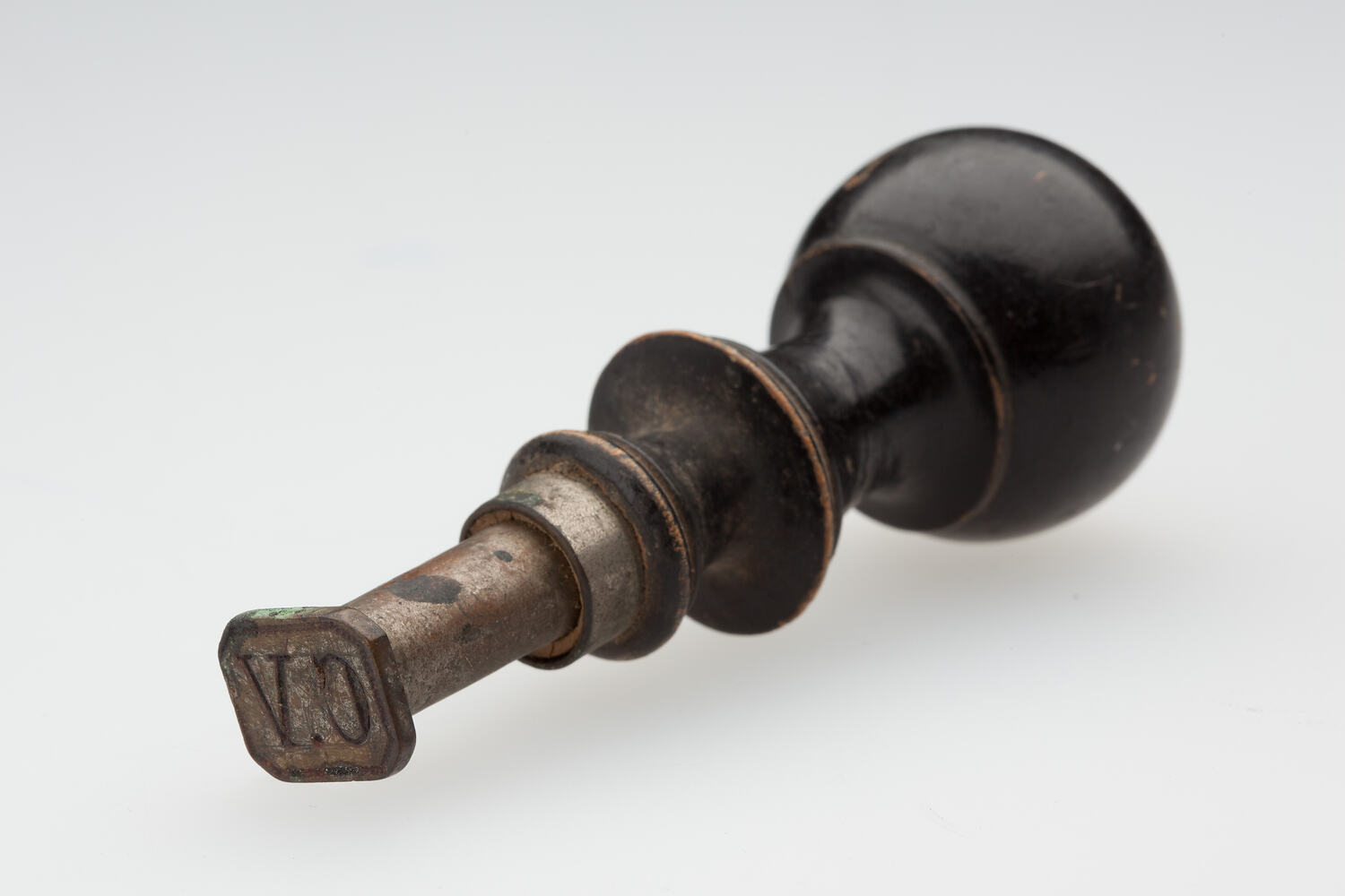 Metal seal with a turned, varnished wooden ebony handle.