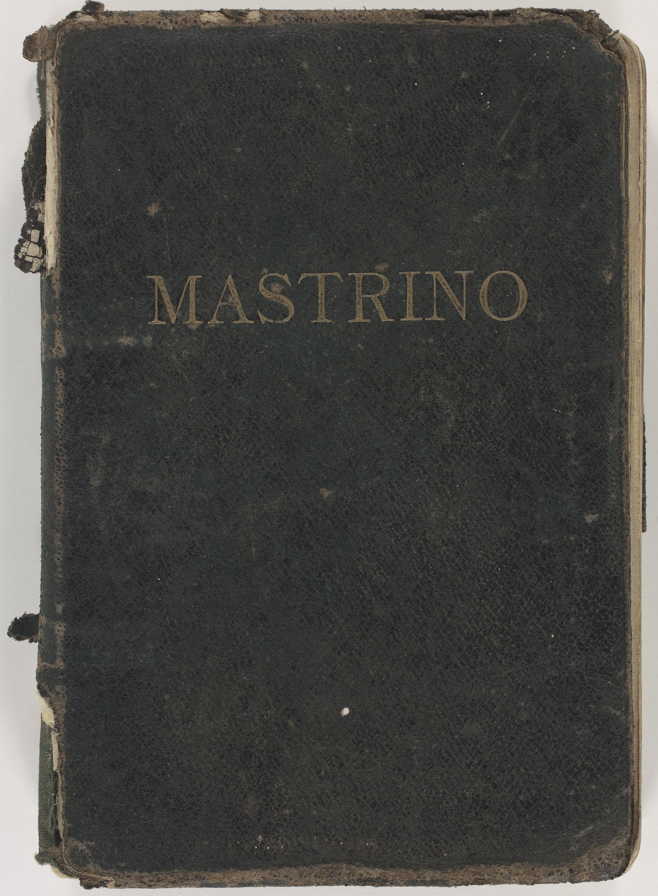 Mastrino notebook with black leather cover. The pages in the notebook are divided into lettered sections. There is extensive handwritten text within the notebook.
