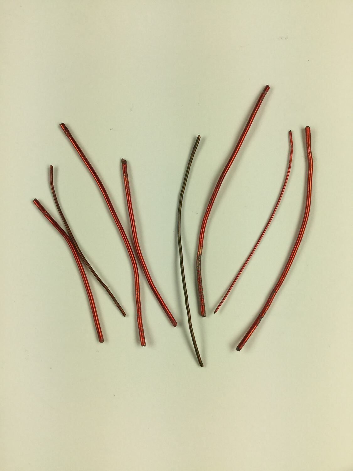 Seven red and one grey wire sprues, used for making glass pieces as part of a Jewish Havdalah set consisting of a Kiddush cup, spice container, and candleholder. They were used by Melbourne artist Ede Horton in her home studio in Camberwell in 2010.