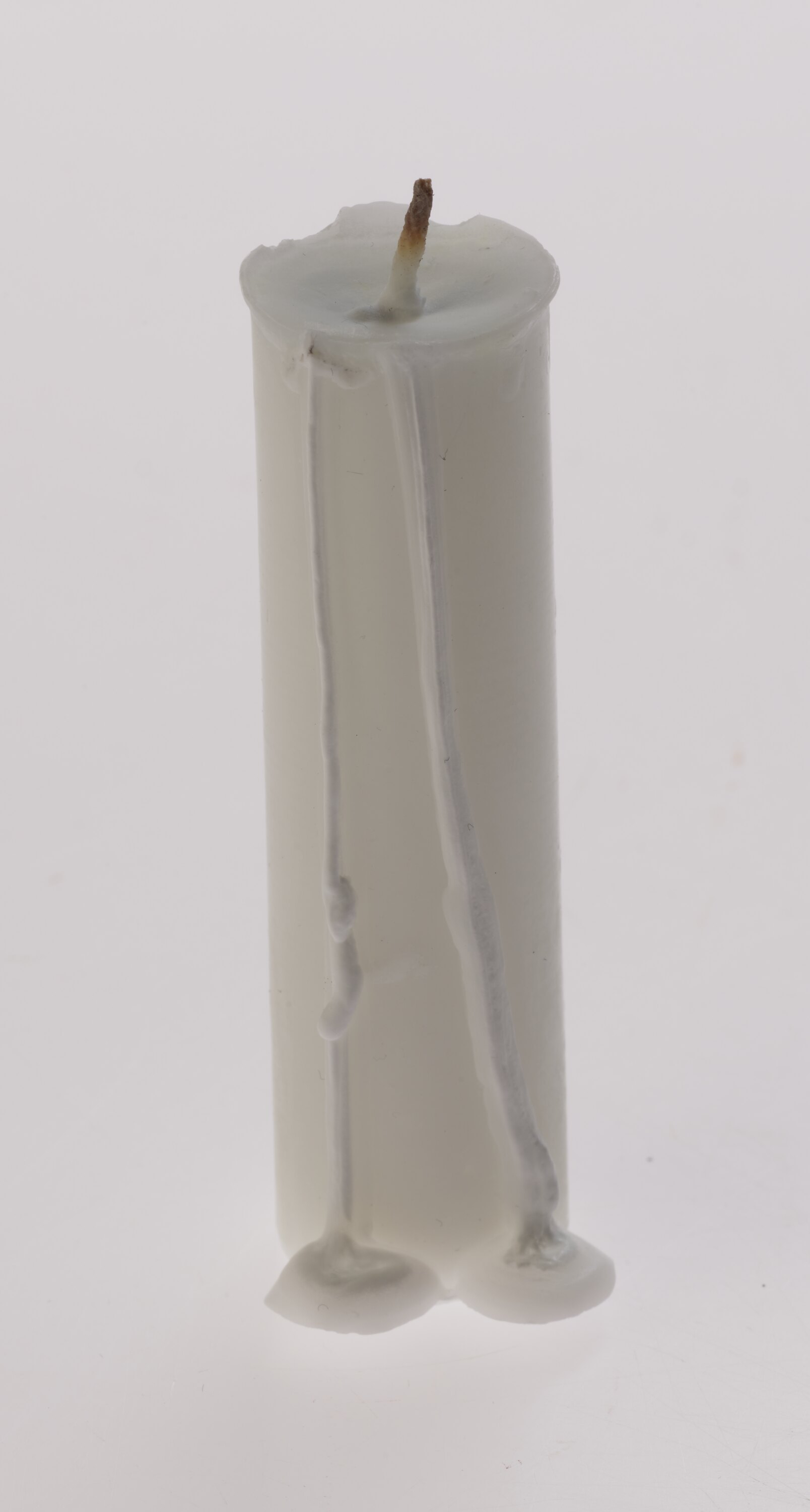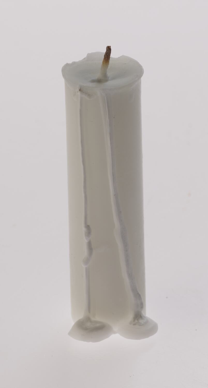 White, partially used wax candle, used as part of a Jewish Havdalah set consisting of a Kiddush cup, spice container, and candle holder. It was used by Melbourne artist Ede Horton in her home studio in Camberwell in 2010.