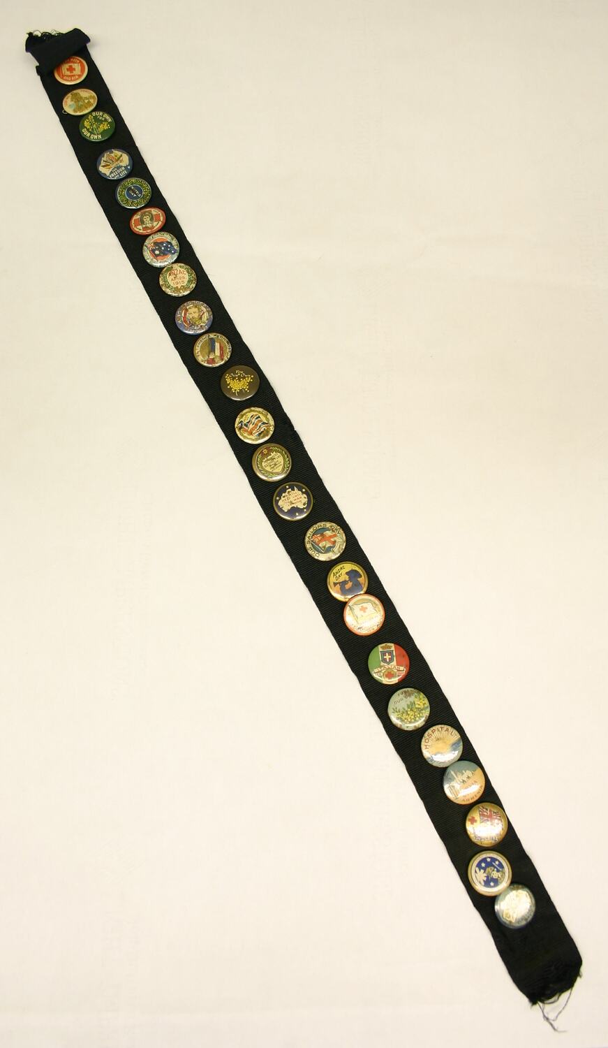 Length of black ribbon, now faded, pinned with 24 badges. The ends of the ribbon have frayed. 1. FOR KITH AND KIN; circular badge with white border and cred centre, red cross flag in the centre with white text. 2. LEST WE FORGET; circular white badge illustrated with a standing soldier. 3. OUR OWN FOR OUR OWN; circular, green badge with white text and two sprigs of wattle set in the centre of the badge. 4. FOR FREEDOM AND LIFE; circular blue badge featuring a map of Australia overlaid with six flags and a banner which reads "allies". 5. WATTLE DAY; circular badge with a blue centre surrounded by graphic colour illustration of wattle flowers and leaves. 6. OUR DAY, NATION & HONOR; circular, red and white badge featuring a black and white illustration of a lady in the centre. 7. FOR OUR FIGHTING MEN; circular badge with a blue border filled with white text, the centre of the badge has a red background overlaid with the Australian flag. 8. ANZAC, Apl 25 1915; circular, white badge featuring an olive branch wreath with red text in the centre. 9. KING GEORGE'S DAY, Copyright; circular badge featuring a portrait of King George. 10. FRENCH RED CROSS; circular, white and gold badge features the blue, white and red French flag in the centre. 11. FOR OUR OWN; circular, brown badge, depicting a spray of yellow wattle. 12. PEACE 1919; white, circular badge with a Union Jack flag in the centre, surrounded by a wreath. 13. DISCHARGED SOLDIERS FUND, for our returned soldiers; circular badge featuring a cartouche with black text in the middle which is bordered by olive branch. 14. I WILL HELP UNTIL THE WAR IS WAR; circular badge with gold border, blue background; in the centre of the badge is a map of Australia bearing red text, there are five stars surrounding Australia.