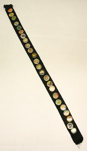 Length of black ribbon with 24 military-related fundraising badges. The badges all date from the World War I era, 1914-1919. They were purchased and otherwise collected by the donor's great-grandmother, Mrs Lillie Mary Holinger. The Holinger family lived at Panton Hill when World War I broke out. They moved to Canterbury, Melbourne, in 1918, and in the 1930s moved to Ferny Creek.