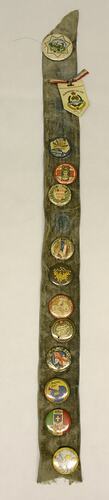 Badges were displayed on ribbons during and after World War I, commemorating involvement in the war effort. Rosalie Triolo notes that children particularly enjoyed displaying badges that they had bought as fund-raisers for the war. One former child, Winifred Grassick, remembered that Red Cross buttons were posted to schools each month by the Education Department. to be sold for a shilling each. 'They surely must have raised a significant sum because they were a regular feature of even our small school. We took an interest and pride in being able to display a ribbon containing the whole sequence', she remembered. (Rosalie Triolo, 2012, 'Our Schools and the War', p.81).