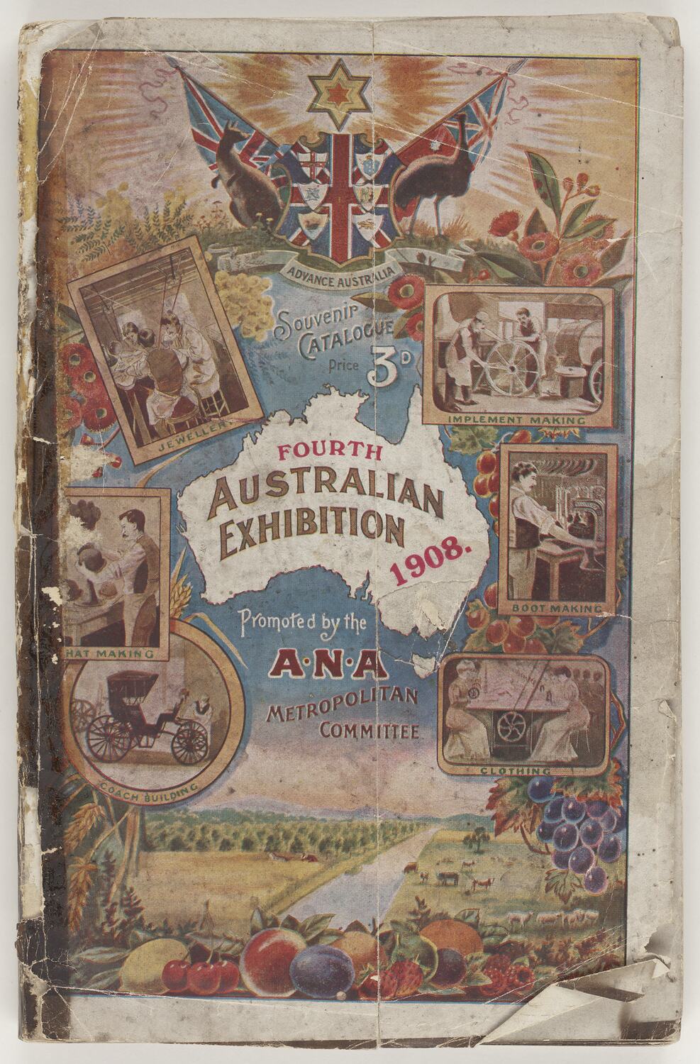 Printed on the front: ADVANCE AUSTRALIA; Souvenir/ CATALOGUE/Price 3D; FOURTH/AUSTRALIAN/EXHIBITION/1908.; Promoted by the/ A.N.A./ METROPOLITAN / COMMITTEE