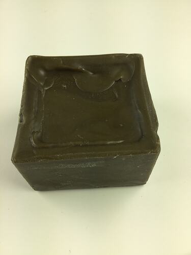 Block of recycled wax, used for melting into master moulds to make glass pieces as part of a Jewish Havdalah set consisting of a Kiddush cup, spice container, and candleholder. It was used by Melbourne artist Ede Horton in her home studio in Camberwell in 2010.