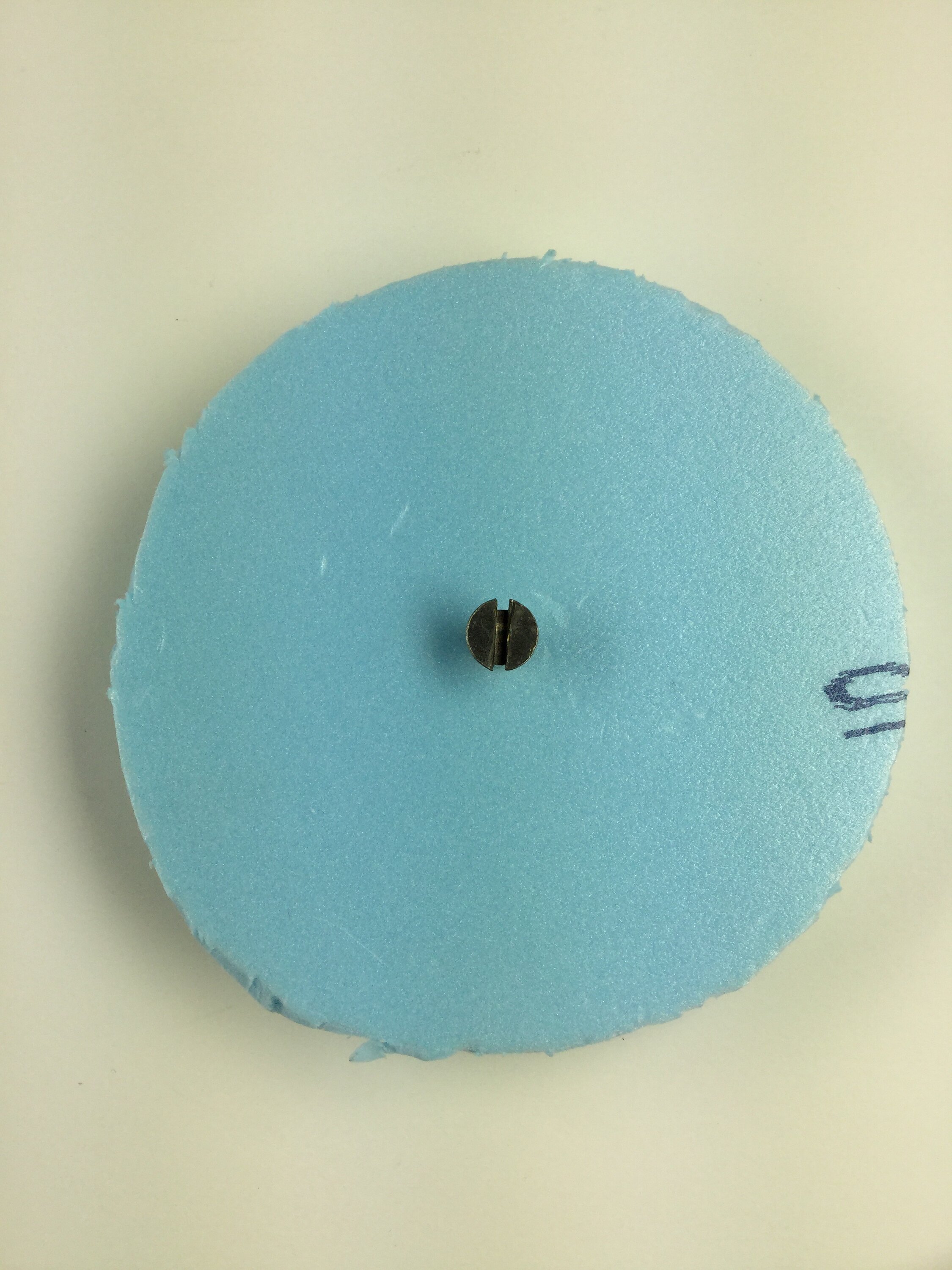 Blue polystyrene support base with a screw, used with the wax candleholder (HT57219) and wire sprues (HT57226) in the process of the plaster silicon construction of a one-use mould to make glass components of a Jewish Havdalah set consisting of a Kiddush cup, spice container, and candleholder. It was used by Melbourne artist Ede Horton in her home studio in Camberwell in 2010.
