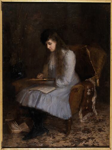 Framed oil painting by Victorian artist Alice Chapman, which was exhibited at the Melbourne Centennial Exhibition in 1888. This work, together with two other oil paintings, was awarded a Certificate of Merit at the Exhibition. The painting shows a young girl, seated with a book and writing pad on her lap. She wears a pale blue dress and has long brown hair. She is seated on a high backed chair in a room with floral carpet. Elaborate, wide frame, bronze in colour, with a leaf pattern around the outer edge.