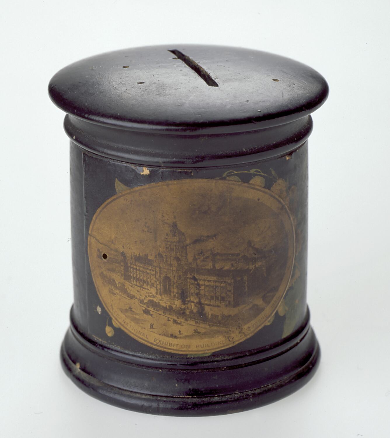 Cylindrical, Japanned wooden money box. Hand painted with snow drops. Paper label with an engraving of the Exhibition Building affixed to the body.