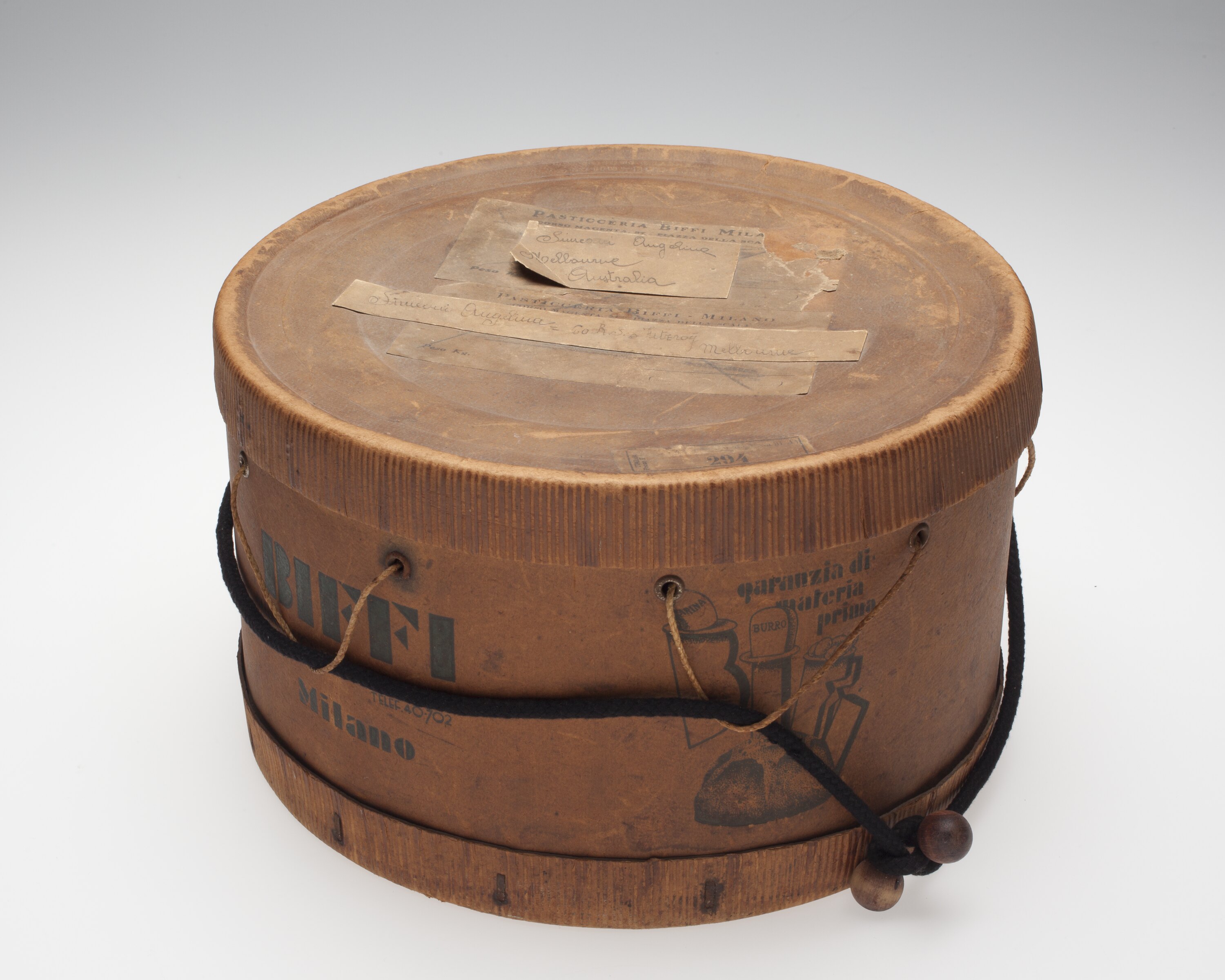 Cardboard panettone container, which has been converted for use as a hat box. Angela Simeoni (nee Beltrame), wife of Massimo Simeoni, brought it with her when she migrated to Australia in 1939. Pasticceria Biffi was a popular café and cake shop located in the Victor Emmanuel Gallery in the centre of Milan. The shop is still operating in the same location.
