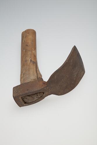 Hand Aze with wooden handle and rusted metal head, with single curving wide blade on one side.