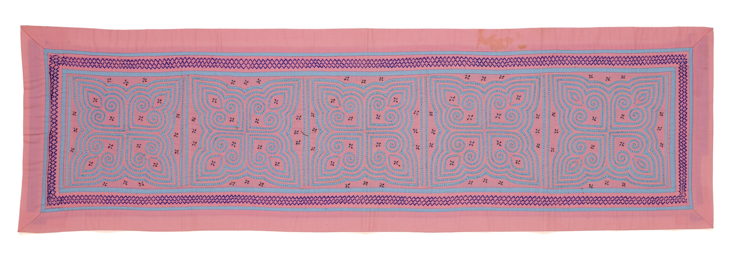 A long rectangular shaped runner made from cotton fabric. There are five identical designs along the centre done in pink material on a light blue background. All together, the designs are surrounded by a thin light blue border, then a wide pink border which is stitched in blue, then another thin blue border, and finally a wide pink one. The back is lined with a plain white cotton.