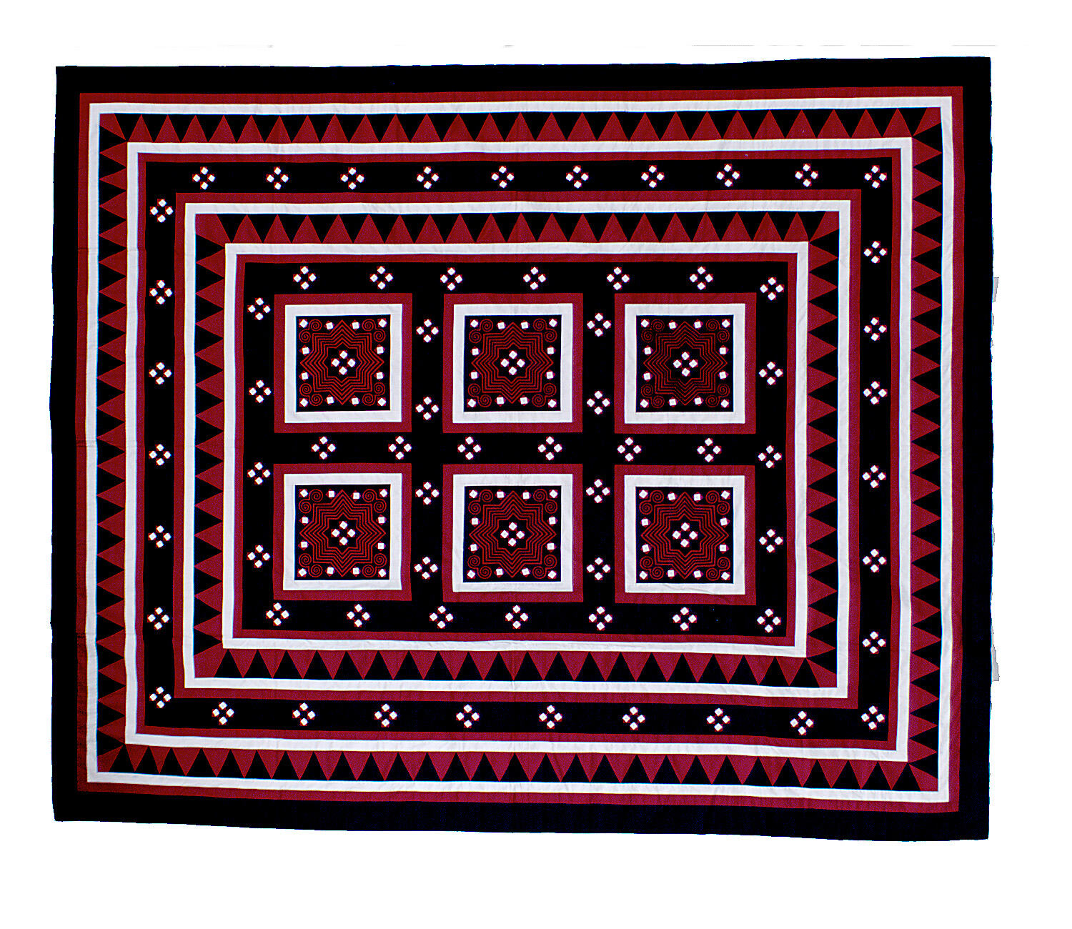 A hand appliqued double bed quilt made from black, maroon and cream cotton fabric. There are six central designs in the centre of the quilt, made using reverse applique technique. Each is surrounded by a thin cream, then white border. These square designs are enclosed in a big black rectangle so the patterns are arranged two across and three down. In this wide black border are small secondary motifs. This is surrounded by a thin maroon border, a thin cream border, and then a wide border made up of maroon and black triangles.The quilt is completed by a thin cream border, a thin maroon border, a wide black border with secondary motifs, a thin maroon border, a thin cream border, a wide maroon and black triangular sequence, a thin cream border, a thin maroon border, and finally a wide black border. The back is lined with plain cream fabric.