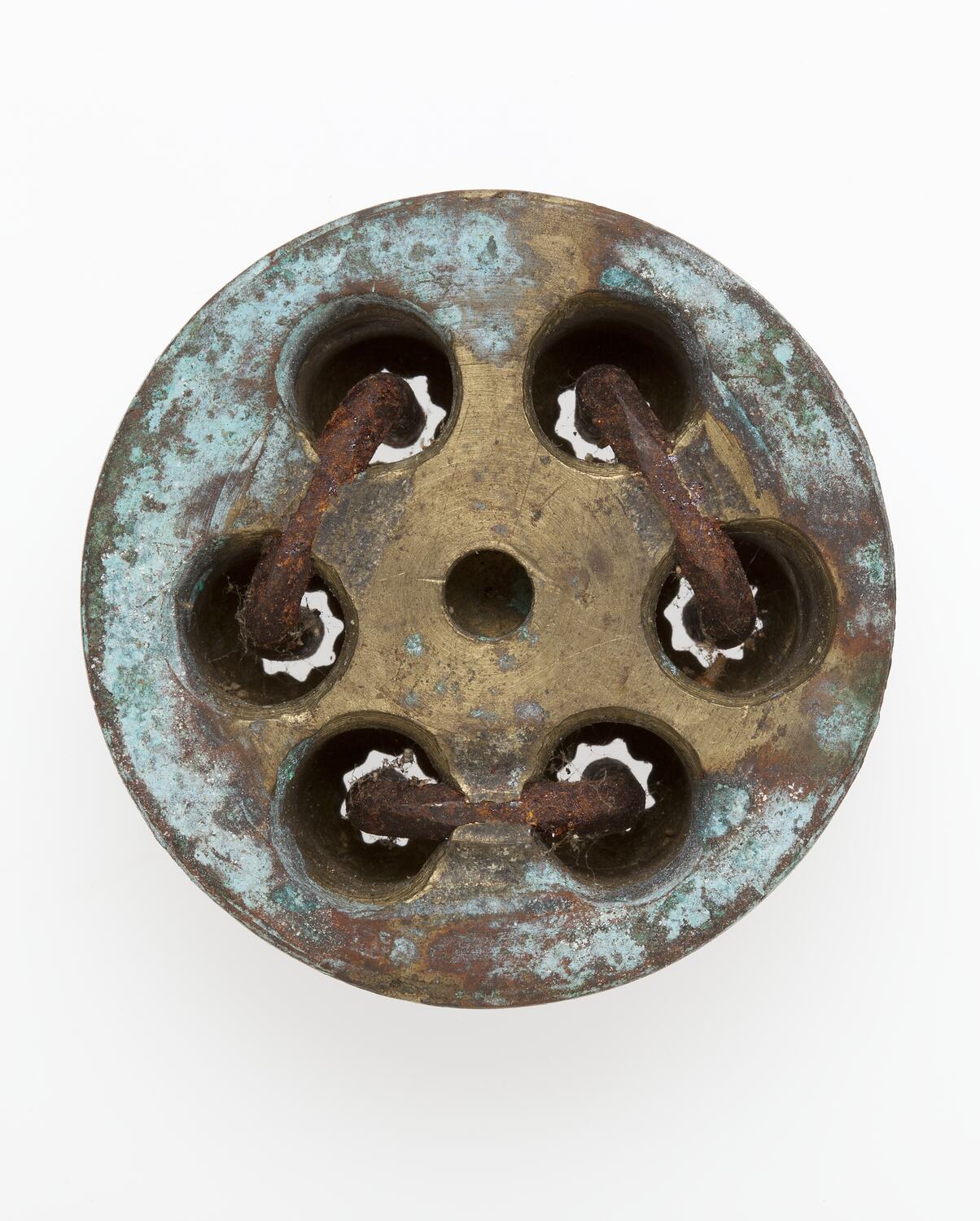 Circular piece of brass, with an small rim and five large holes which narrow as they pass through to the other side. Each pair of holes has a c shaped piece of metal in it which leaves only a small space around the edges of the narrow holes.