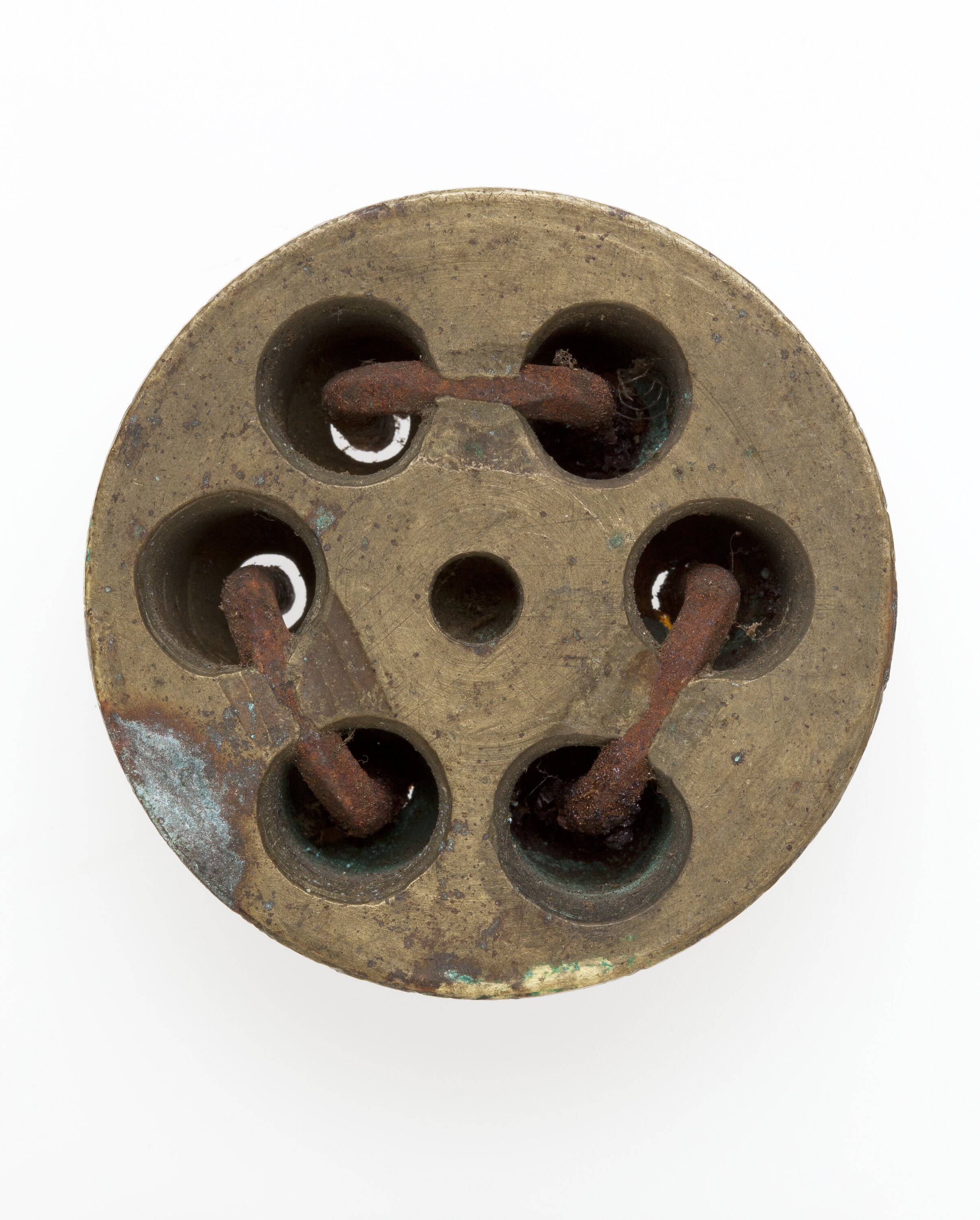 Circular piece of brass, with an small rim and five large holes which narrow as they pass through to the other side. Each pair of holes has a c shaped piece of metal in it which leaves only a small space around the edges of the narrow holes.