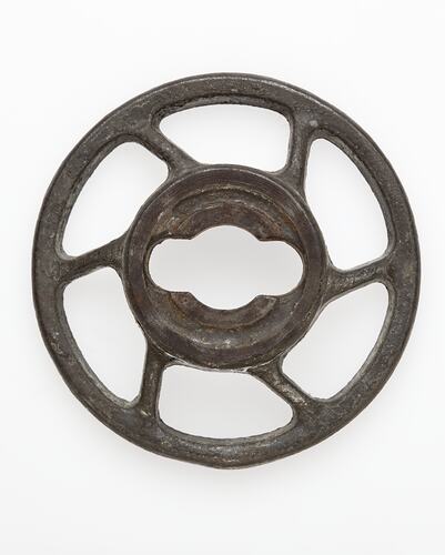 Circular attachment for a pasta or sausage maker, it was either brought to Australia by Vincenzo Candela and his wife Emanuela Nigro or purchased here, when they migrated in 1920. The Candelas made much of their own food including homemade pasta, tomato sauce, wine, sausages and they roasted their own coffee. Items that could not be purchased in Australia were often ordered by mail from the Italian manufacturer. This was a practice common in both Italy and Australia. Vincenzo also received catalogues from Italy after his migration to Australia.