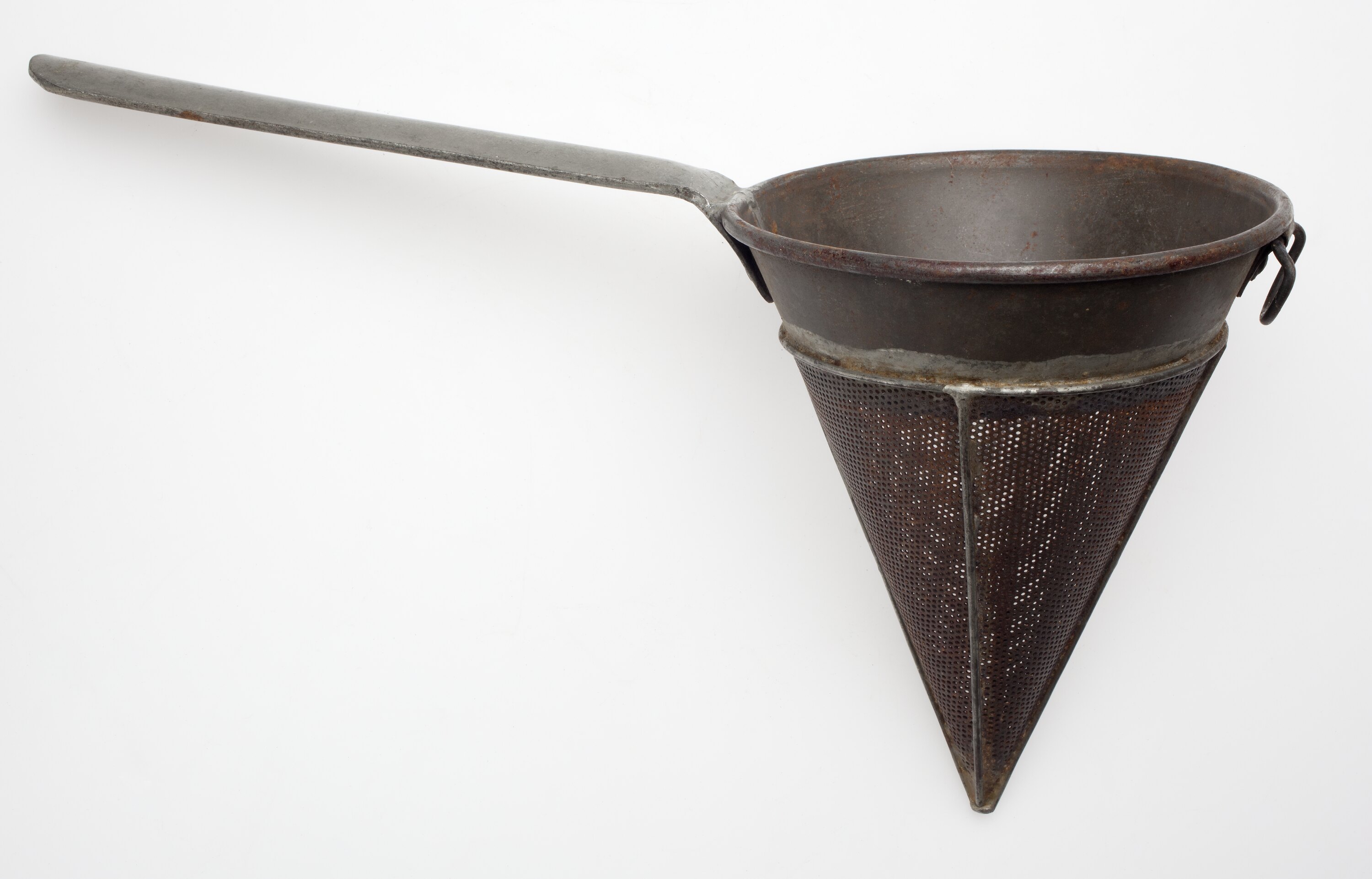 Cone shaped metal strained, with a long handle.There is a thick band of metal at the top, then the rest is composed of fine metal mesh with small circular holes.