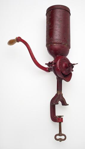 Metal tomato paste maker consisting of mincing unit which is operated by a long curved metal handle with a tapered wooden knob. The unit has a metal circular blade which is held in place with several wing nuts, and a large curved lip. At the base is a `G' clamp so that the unit can be secured to a bench. At the top is a container to hold the tomatoes before they are pulped, which has been extended by the addition of a metal coffee tin. The whole unit has been painted red.