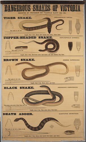 A wall chart titled "Dangerous Snakes of Victoria", which is divided into five parts. The wall chart in the u.c. depicts a tiger snake, with smaller graphic drawings of the head and body of the tiger snake in the u.l. of the chart. There are also graphic drawings of the tiger snake in the u.r. of the snake's head. Below the tiger snake is a picture of a copper-headed snake in the lower u.c. and there are graphic drawings of the head of the snake in the u.l. There are also graphic drawings in the u.r. of the head of the copper- headed snake. In the c. of the wall chart a brown snake is depicted with smaller grapic drawings in the c.l. and c.r. of the brown snake's head and body. The l.c. of the chart has a picture of a black snake, with a drawing of the snake's body in the l.l. and the snake's head in the l.r. Beneath the black snake in the l.c. is a drawing of a death adder. There are also graphic drawings in the l.l. of the snake's body and in the l.r. of the death adder's head.
