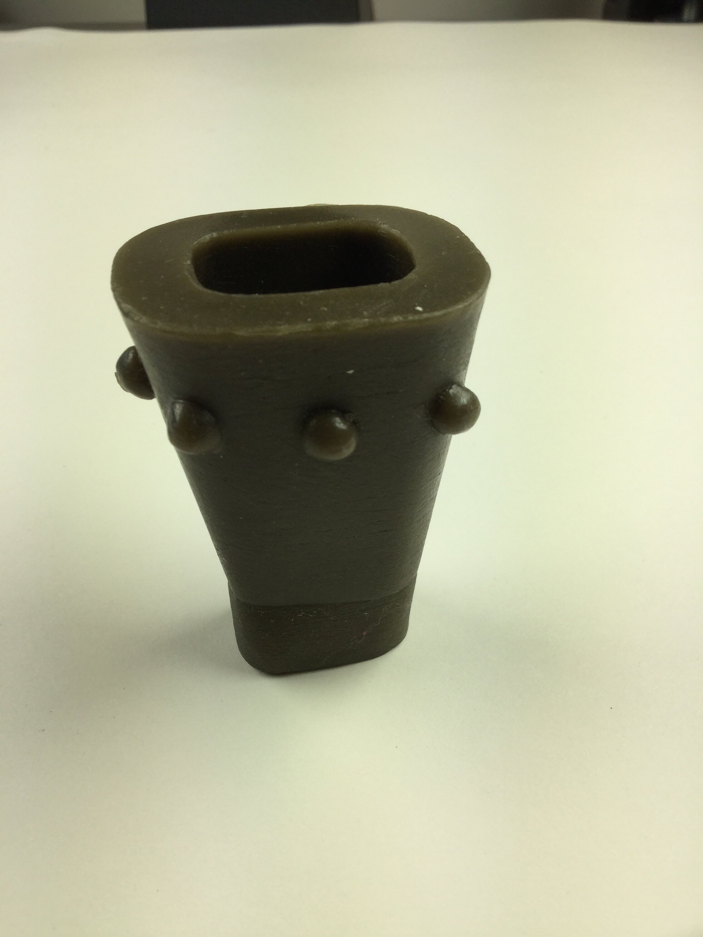Brown wax candleholder, cup shaped, tapering at base, open at top. Circular decorations around the outside in bass relief.