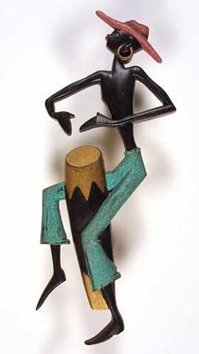 Black figurine wearing green pants and playing a conga drum that was once displayed at the Black Cat Cafe in Brunswick Street, Fitzroy, until it closed in February, 2001. Belongs to set of three figurines.