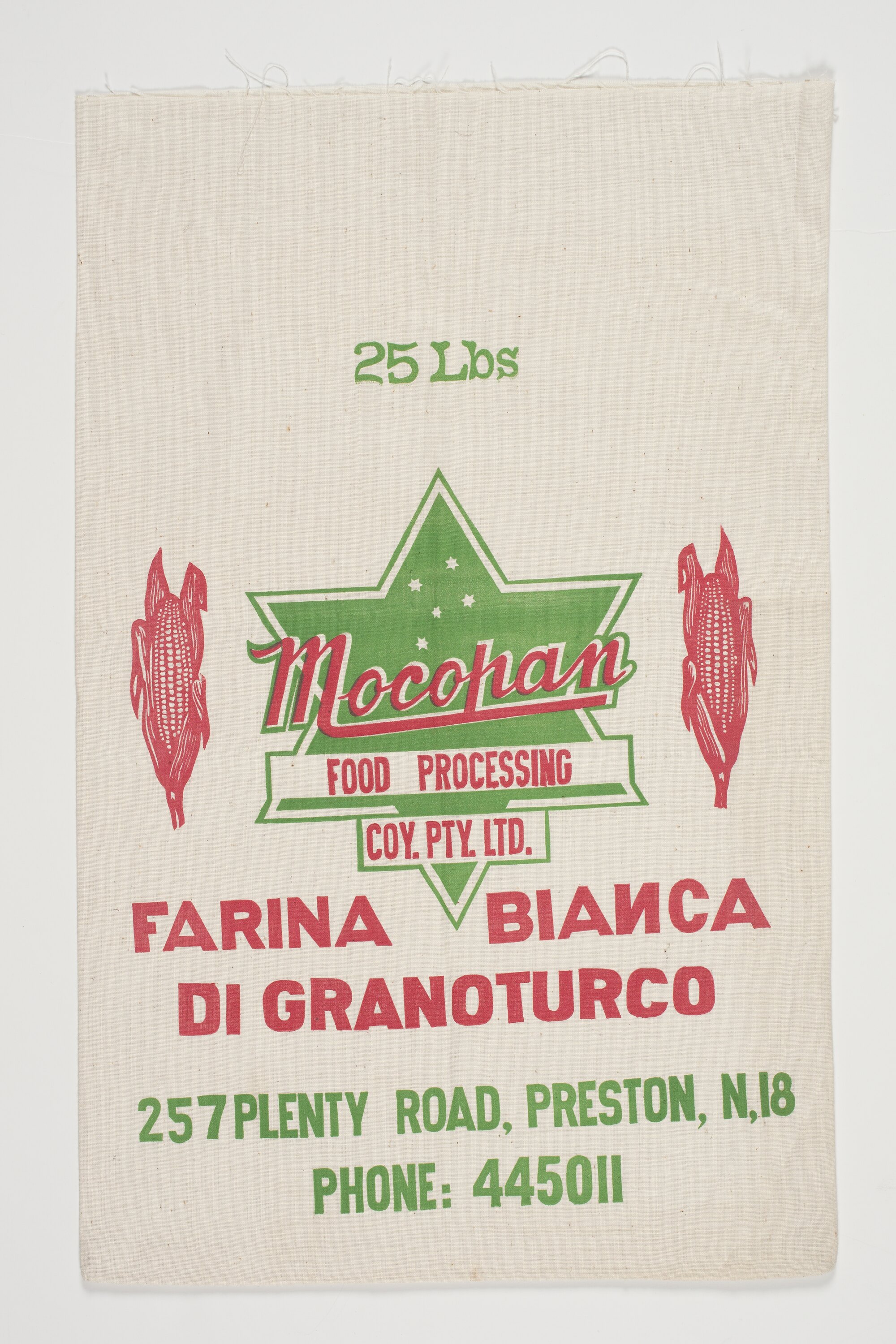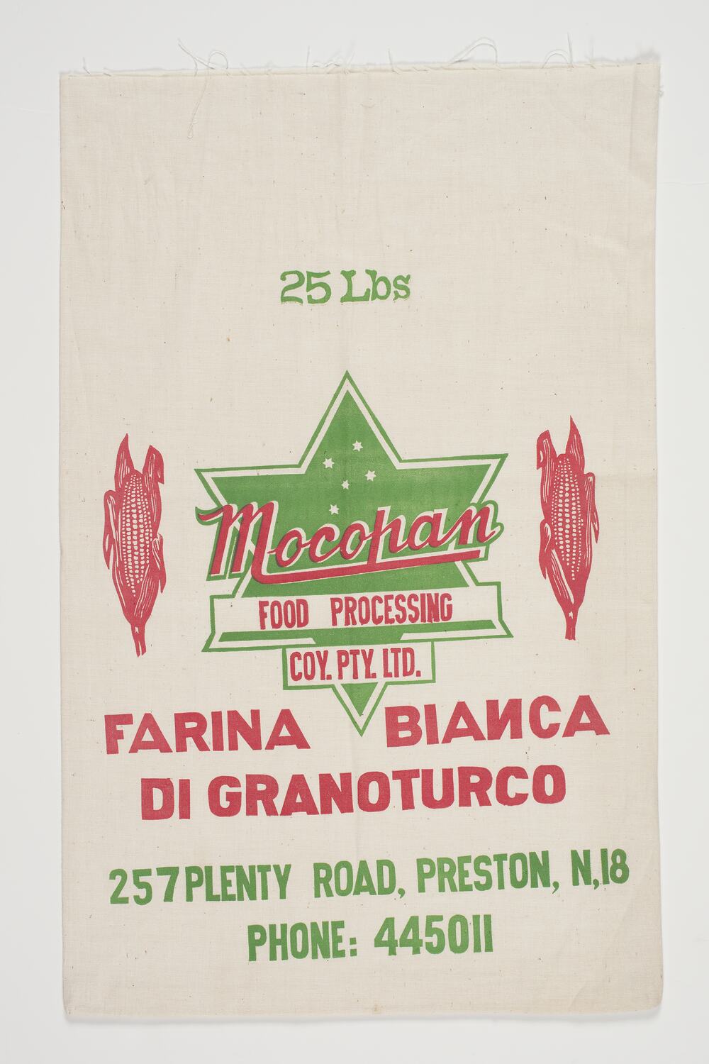 On front: 25 Lbs (printed in green)/Mocopan /FOOD PROCESSING/CO. PTY. LTD./ FARINA BIANCA/ DI GRANOTURCO (printed in red)/257 PLENTY ROAD, PRESTON, N,18/PHONE: 445011 (printed in green)