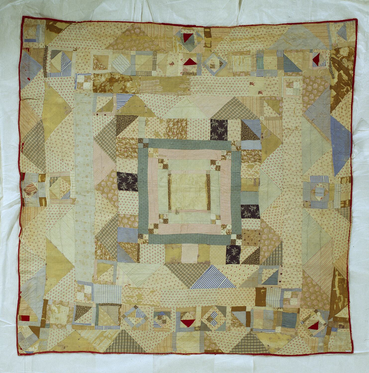 Hand-pieced two-sided quilt. Pieced sides attached to cream woollen blanket with parallel rows of machine stitching. One side has a wide red border and geometric pieces are in red blue and pale-coloured printed cotton fabric. The other side has a similar geometric pattern but is worked in paler fabrics in pink, brown and pale blue prints.