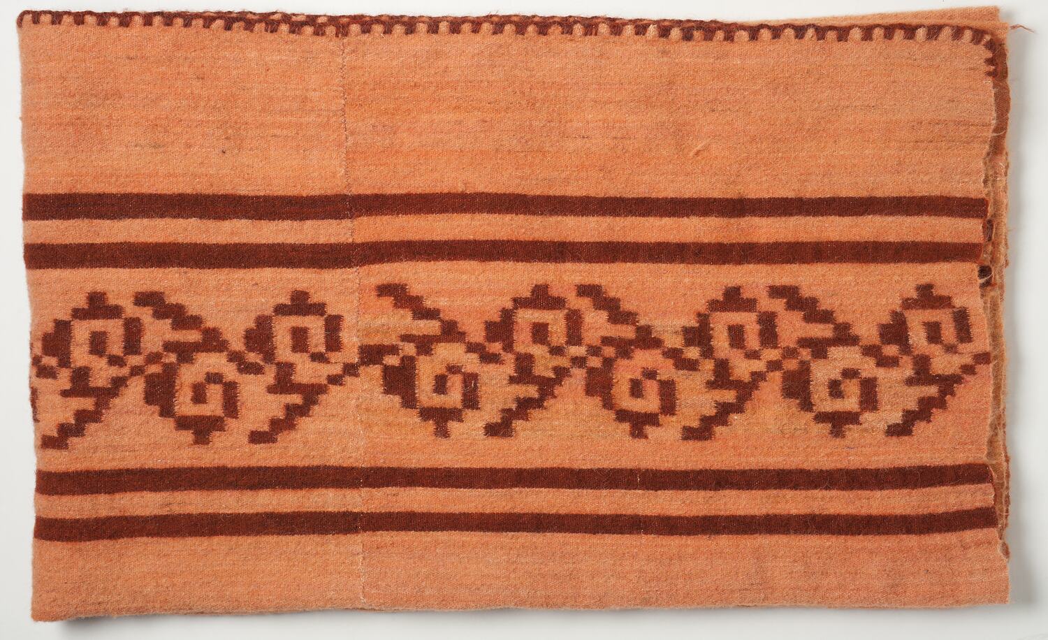Woven wool blanket, with tan pattern on orange background, and tan blanket stitch around edges. The design consists of a repeating geometric motif boardered by double lines on each side.