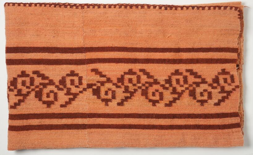 Blanket orange and tan wool, which forms part of the dowry of Irene Soumilas. Irene migrated to Australia from the Greek Island of Lefkas in 1958 to be married in 1959. Her dowry travelled in two trunks by ship, although she travelled by air. Many of her dowry items were made by local craftswomen, although other items were given to her by family and friends still living in Greece.