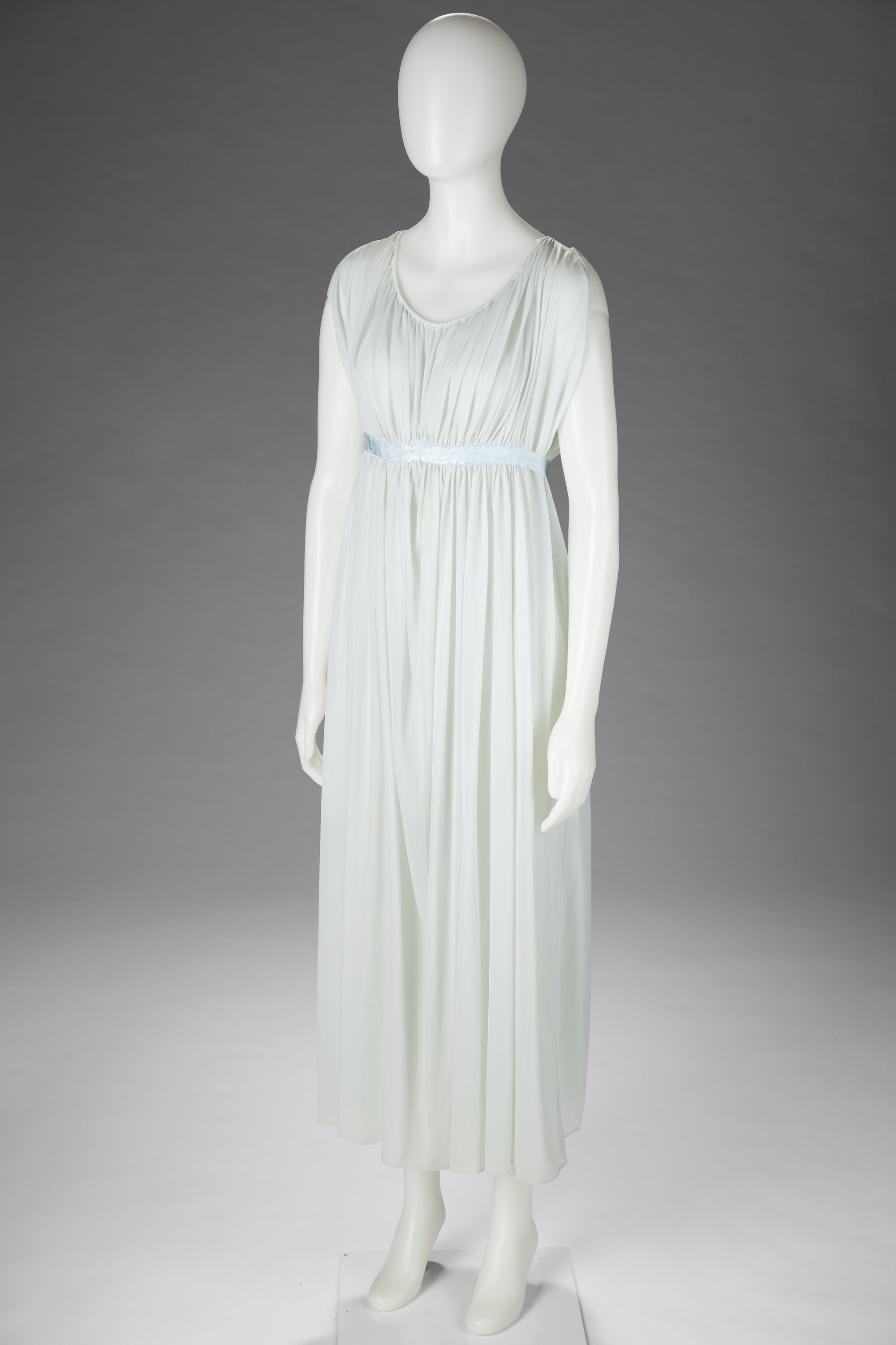 Full length sleeveless negligee made from pale blue nylon. It has a scoped neckline, a pale blue satin ribbon just under the bustline and the fabric falls in soft pleats from the neckline. neck
