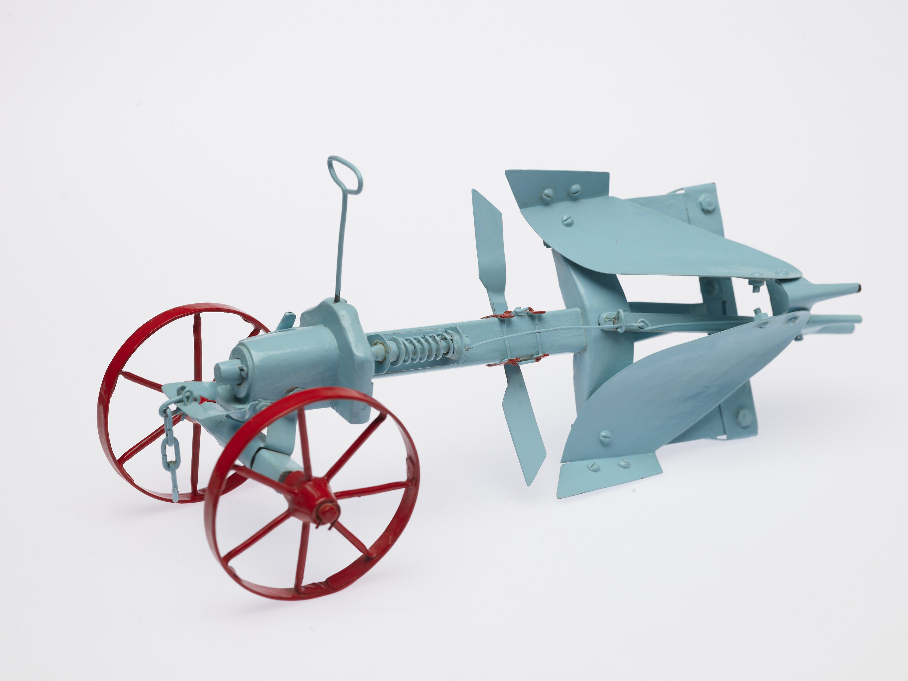 Aqua-painted metal drag plough with red painted metal wheels in working condition.
