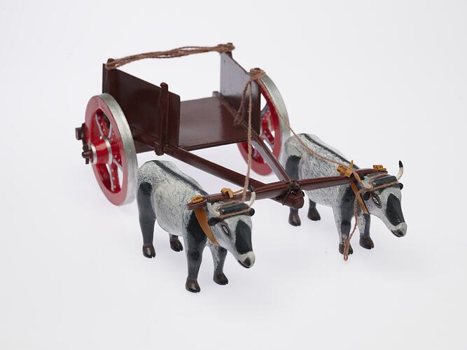 Brown painted cart with red and silver painted wheels. Two grey and white painted bullocks at front of cart connected with timber yoke and secured to yoke with vinyl ties. Brown twine wrapped around bullock horns to secure to cart. Additional twine criss-crossed to rear posts of cart.