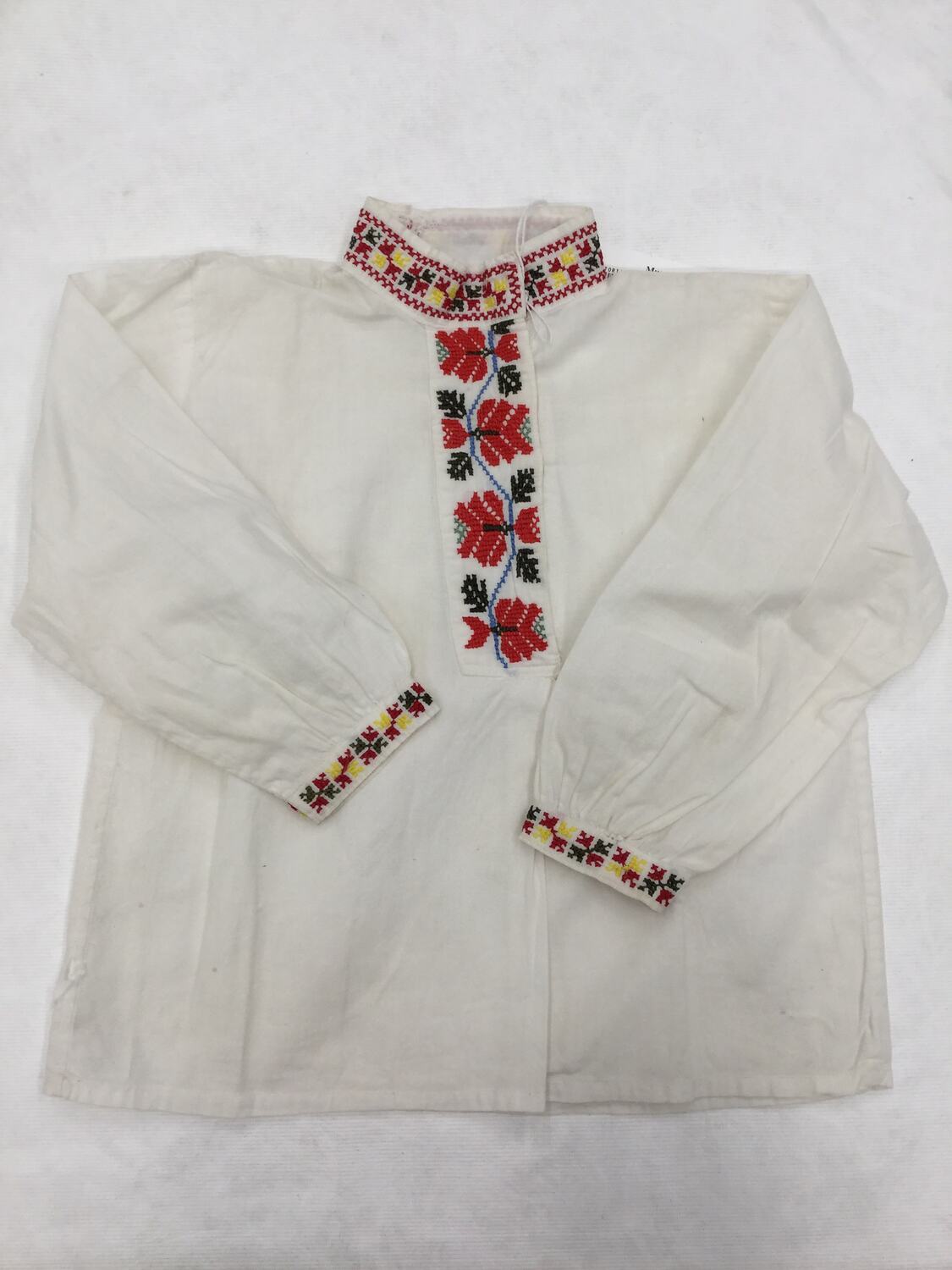 White cotton, long-sleeved shirt with red, yellow, green and blue embroidered details around collar, down the front (geometric floral design) and around the cuffs.