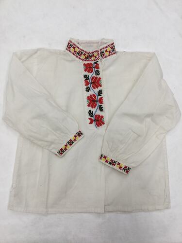 Traditional Belarussian child's shirt, hand made and embroidered in Melbourne about 1953 by post World War II refugee from Belarus, Maria Basaranowicz. She made it for John Alexander Kazuro, around one year old at the time, the son of Marie and Alexander Kazuro. It was worn by him to represent the Belarussian community with his father in the multi-national parade to welcome Queen Elizabeth and Prince Phillip to Melbourne in 1954. His father Alexander who accompanied the boy wore a similar shirt.