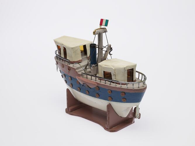 Wood model of ship. The model ship is painted white blue and pink with metal balustrade railing on top deck. Painted cream metal cabin on forward and aft of the model with fishing trawl lines and a flag pole with miniature paper Italian flag. Two life boats port and starboard and metal anchor. Movable rotating metal subwater blades on stern.