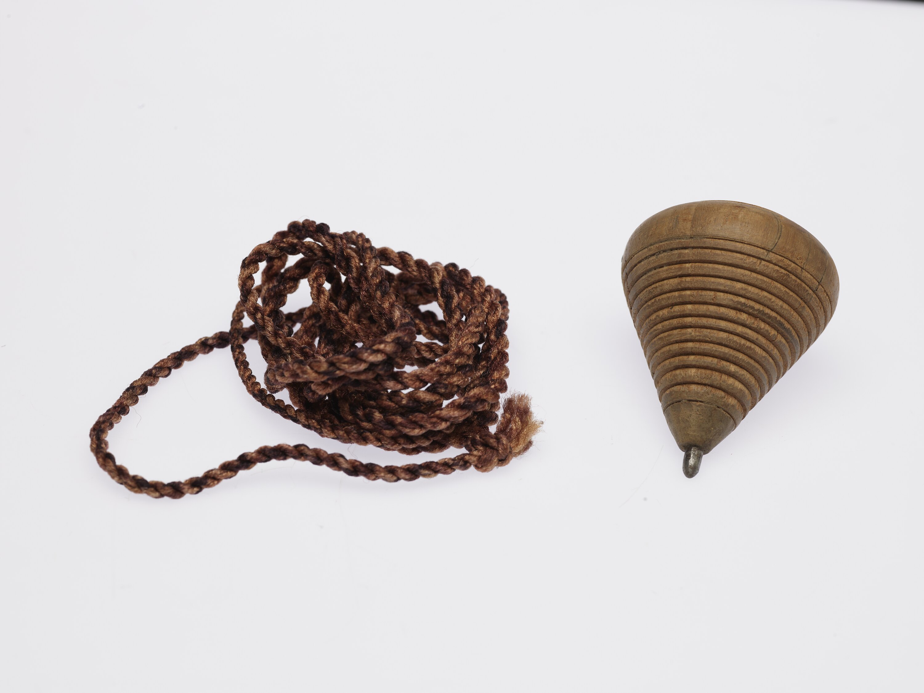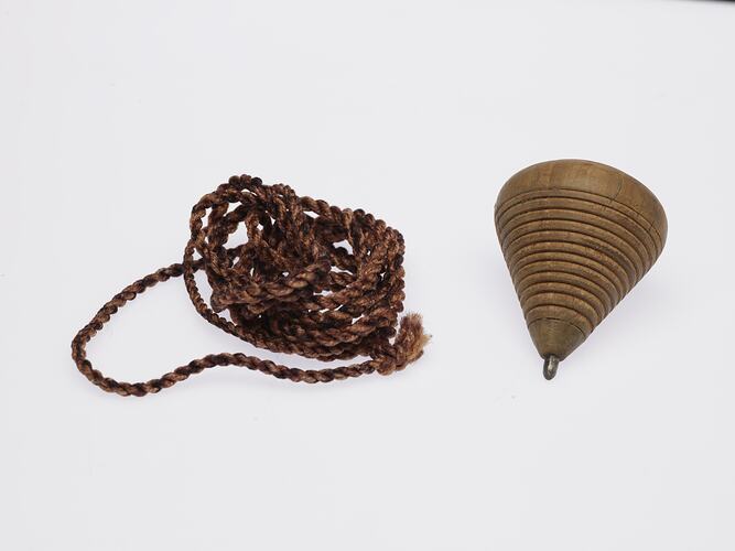 Wood spinning top with metal tip, graduating grooves that hold in place a string which is used to pull, creating a forward energy that allows the top to spin on its metal tip. The top is solid wood but has a large conical crack on one side which has been secured in place with three small nails. A synthetic brown string included.