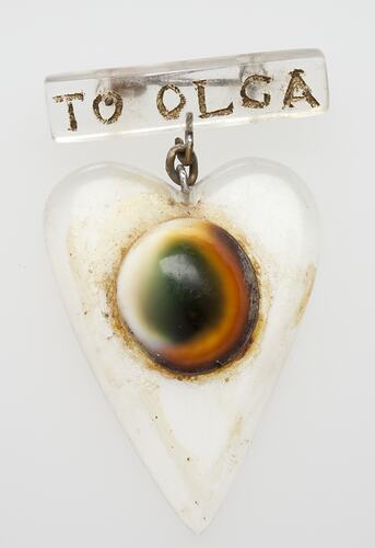 Brooch in shape of a heart with a round decoration. The words 'TO OLGA' are inscribed on a rectangular badge attached to the top of the brooch. There is a small loop of chain and a safety pin attached to the top of the brooch.