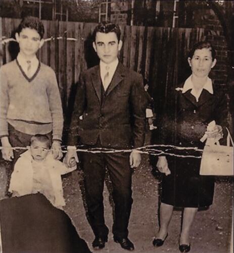Digital photograph of Efstathia Spiropoulos and her three sons Apostolos, Konstadinos and baby Anastasios, outside the Greek Orthodox Church Evagelismos in Victoria Parade, East Melbourne, 1964