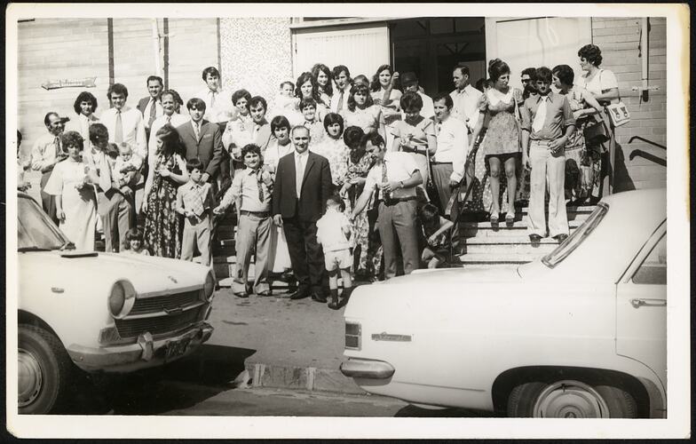 Digital photograph of the extended Spiropoulos family at the christening of Efstathia's first grandchild at Saint Vasilios Greek Orthodox Church, Briunswick, 1974. Peter Spiropoulos is at centre of the photo and youngest son Anastasios to his left.