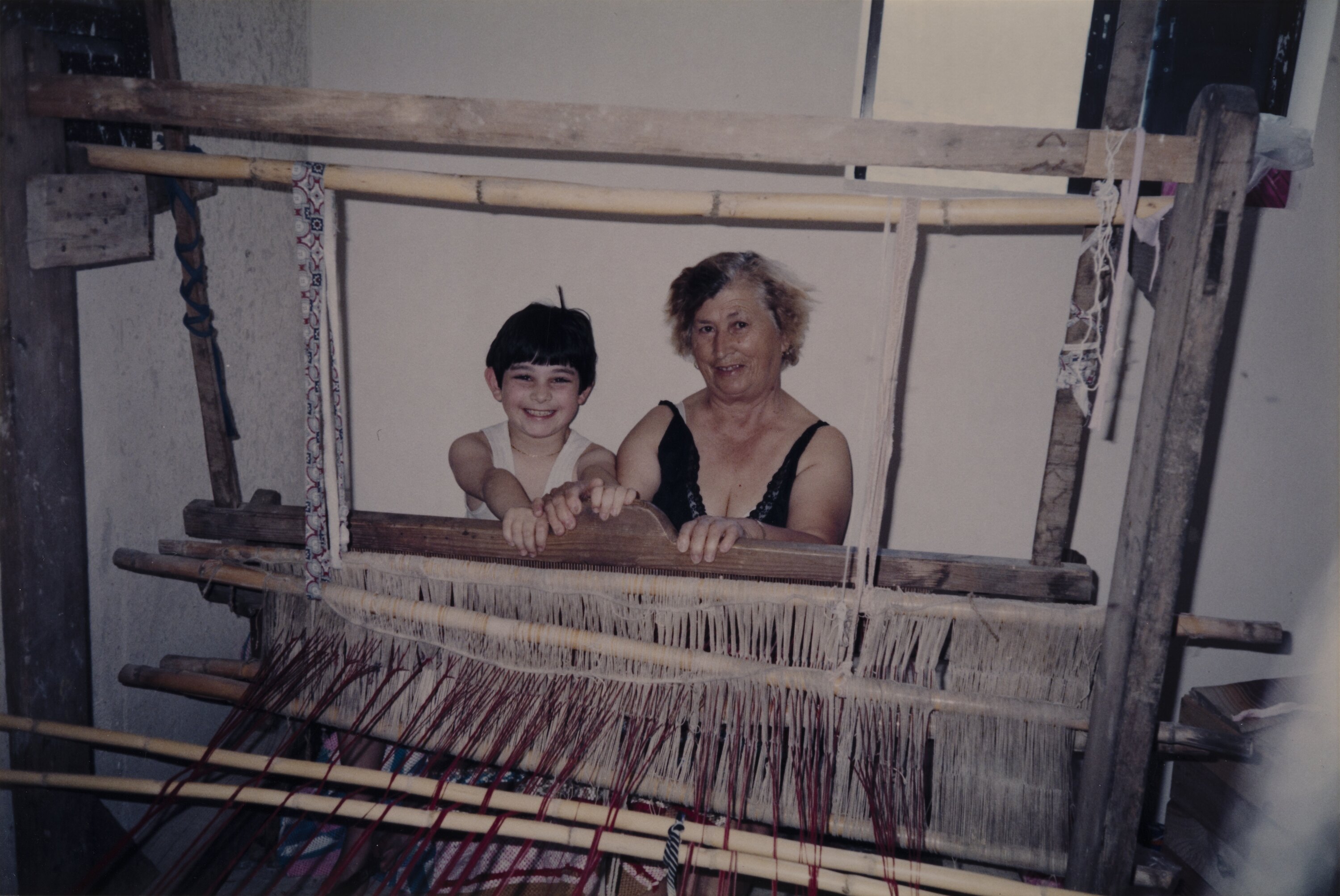 Digital photograph of Efstathia Spiropoulos with her grandson Christopher with a loom at her family home in the village of Flessiada in the Pelopponese in Greece during a return visit in 1992. The photograph was taken by Effie's daughter Stavroula.